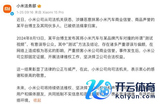 1 月 25 日,小米法务部通过官方微博发布声明称,2024 年 8 月 13 日,某平台博主发布其将小米汽车与某品牌汽车对撞的所谓"测试视频",终点误导公众。其中"测试"措施及论断,存在诸多严重流毒与偏颇,在收罗上形成极为恶劣的影响,严重损伤小米公司生意信誉。事件发生后,小米公司立即固定凭据,开展法律维权职责,将强捍卫公司正当权益。