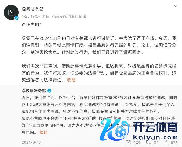 小米法务部发声后,极氪法务部也于 1 月 25 日晚间发布了《严正声明》。声明中提到:"早在 2024 年 8 月 16 日,就针对干系坏话进行过辟谣,并标明了严浩气派。但是在 1 月 25 日,极氪发现部分账号借此事再度对极氪品牌进行无端指令和膺惩,企图误导公众、制造公论焦点。对此,极氪也曾进行了凭据固定。"极氪法务部称,极氪再次严正声明,借助此事情坏心指令、谩骂极氪凯时体育游戏app平台,对极氪品牌的名誉形成损伤的举止,公司将给与一切必要的法律行动,爱护极氪品牌的正派正当职权,讲求驳诘者的法律包袱。