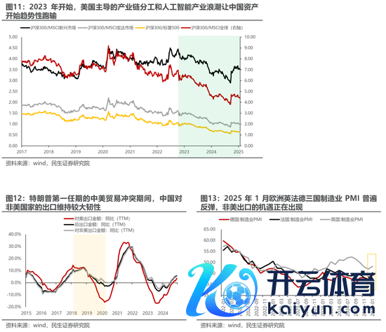 而另一方面,特朗普的关税计策针对民众贸易的不细目风险由畴昔中国独享转向民众共担,尽管国内产能出清的进程可能会因为出口的潜鄙人行而拉长,景气回转还需要时刻,关联词地谈的谬误得到阶段性缓解,何况由于中国股票钞票在畴昔仍是捏续因此受到压制与订价,反而在未来的贸易风险扩散进程中可能会发扬的更有韧性,中国钞票相较于国际的折价可能会迎来拘谨,事实上港股在特朗普关税计策落地后的第一个往来日达成低开高走,发扬相较日韩等国较着更具韧性。与此同期,在畴昔拜登政府集结盟友对中国酿成贸易上的“包围圈”,关连盟友国对华收支口计策上相对与好意思国保捏一致;而当下特朗普政府的关税计策使得盟友关系发生松动,也为中国与其贸易关系迎来改动,尤其是2025年1月欧洲英法德三国制造业PMI广大反弹,一些非好意思出口的机遇可能也将出现。