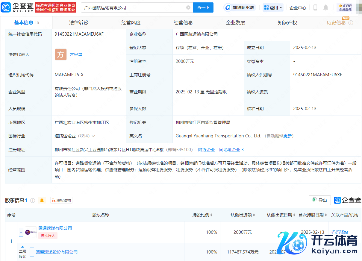企查查APP涌现,近日,广西圆航运输有限公司设立,法定代表东说念主为方兴星,注册老本为2000万元,计较范围包含:说念路货品运输;国内货品运输代理;供应链处分劳动;运输开辟租出劳动等。企查查股权穿透涌现,该公司由圆通速递(600233)转折全资执股。