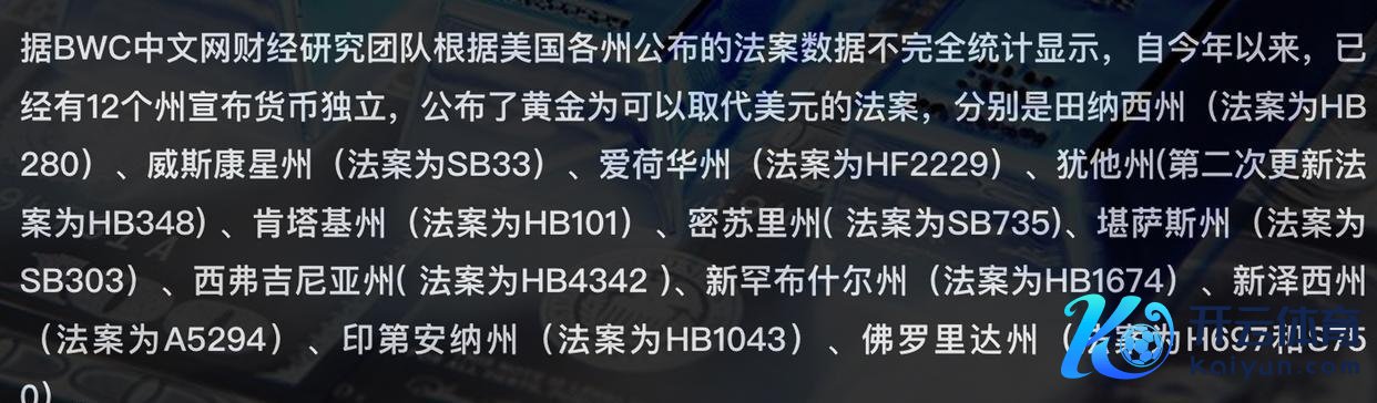 而让东谈主偶而的是,好意思国国内也开动“兵分两路”。一些州还是开动不买“好意思元”的账了。比如亚利桑那州、德克萨斯州和佛罗里达州的议员皆建议了回想金本位的提案,趣味是让黄金再行成为好意思元的锚定物。还有几个州更是平直取消了黄金的往返税,荧惑黄金和好意思元“平起平坐”。到目下,好意思国还是有48个州明确暗示,他们要在货币上独处于好意思元,其中40多个州还取消了黄金往返的税收。